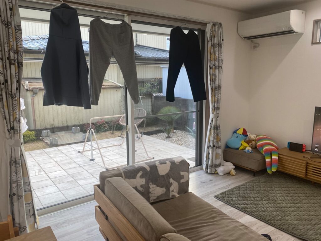 和室に物干し場を作らなかったために、逆にリビングにも干されるという本末転倒。しかも窓側に干されるので、日当たりも遮られ景色も最悪で踏んだり蹴ったりでした。