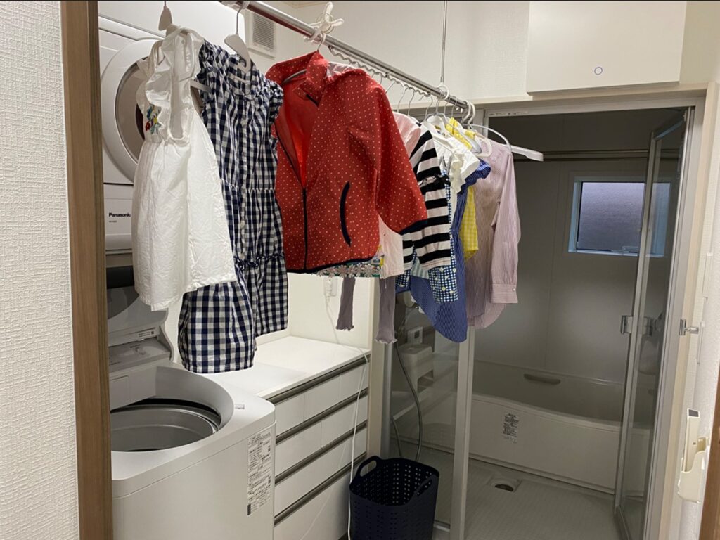 リビングに隣接した和室でしたので、ここに干されるとウザいなと思って作らなかったのですが、うちの妻はもうリビングのカーテンレールや和室の鴨居とかで干しちゃいますよね。