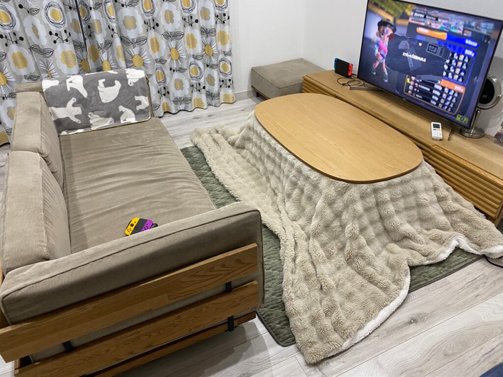 ただ、こたつを置くと狭くて入る余地すらありませんので、今はこたつをテレビ側に寄せています。ここだけの話もうちょっとだけ広さは欲しかったかもですね。