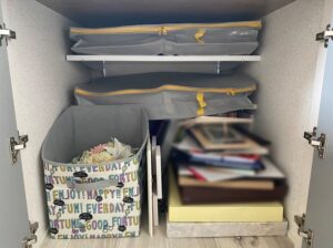 思い出専用の収納があると保管する上限を決めることができます。定位置が決まっていないと、いろんなところに保管してめちゃくちゃ増えてしまいますからね。