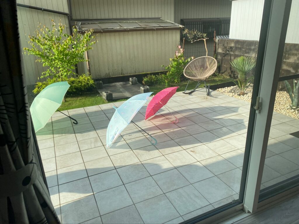 傘って畳んだまま放置するとカビて臭いので、晴れた日には開いて干すことにしています。うちはタイルデッキで干してますが、このように傘が干せる場所があると便利ですよ。