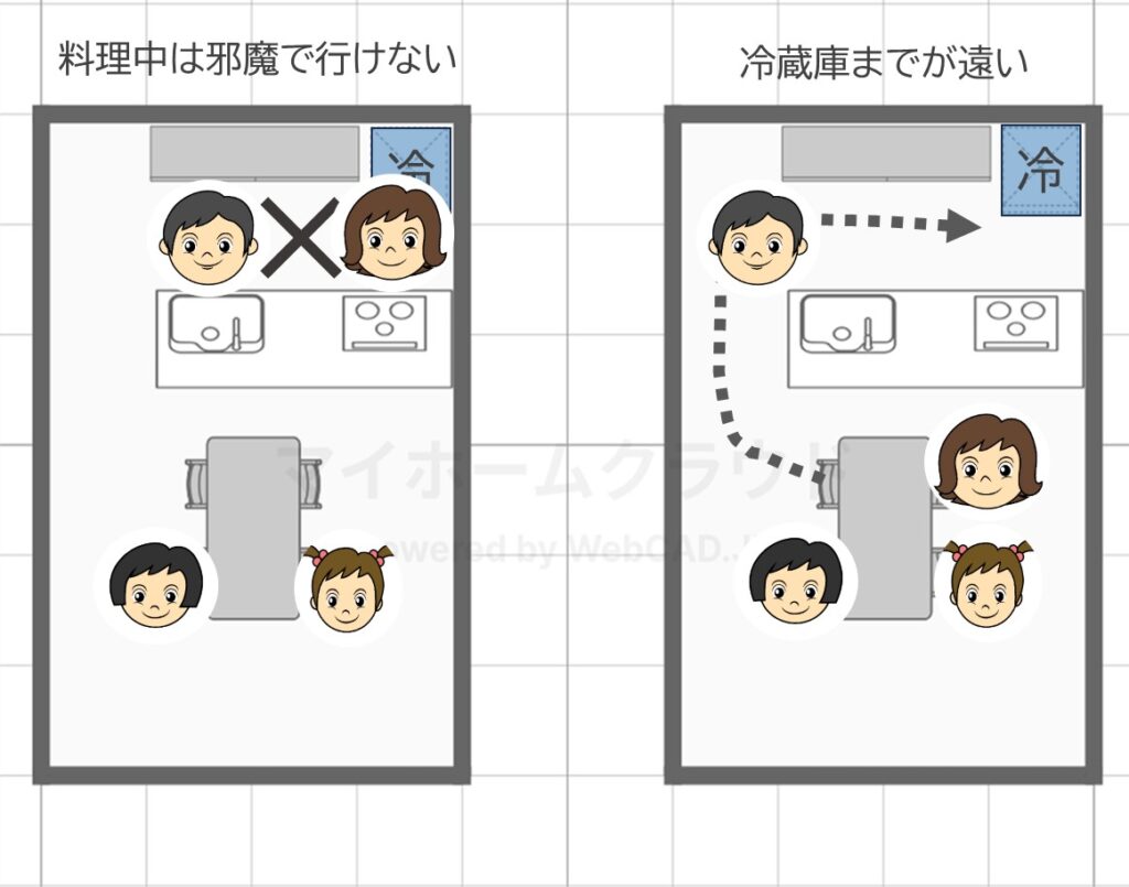 それは、キッチンで料理中に他の誰かが冷蔵庫に来るとすんごい邪魔、ダイニングからの動線が悪すぎるということ。両方ともかなり致命的な欠点と言えるでしょう。