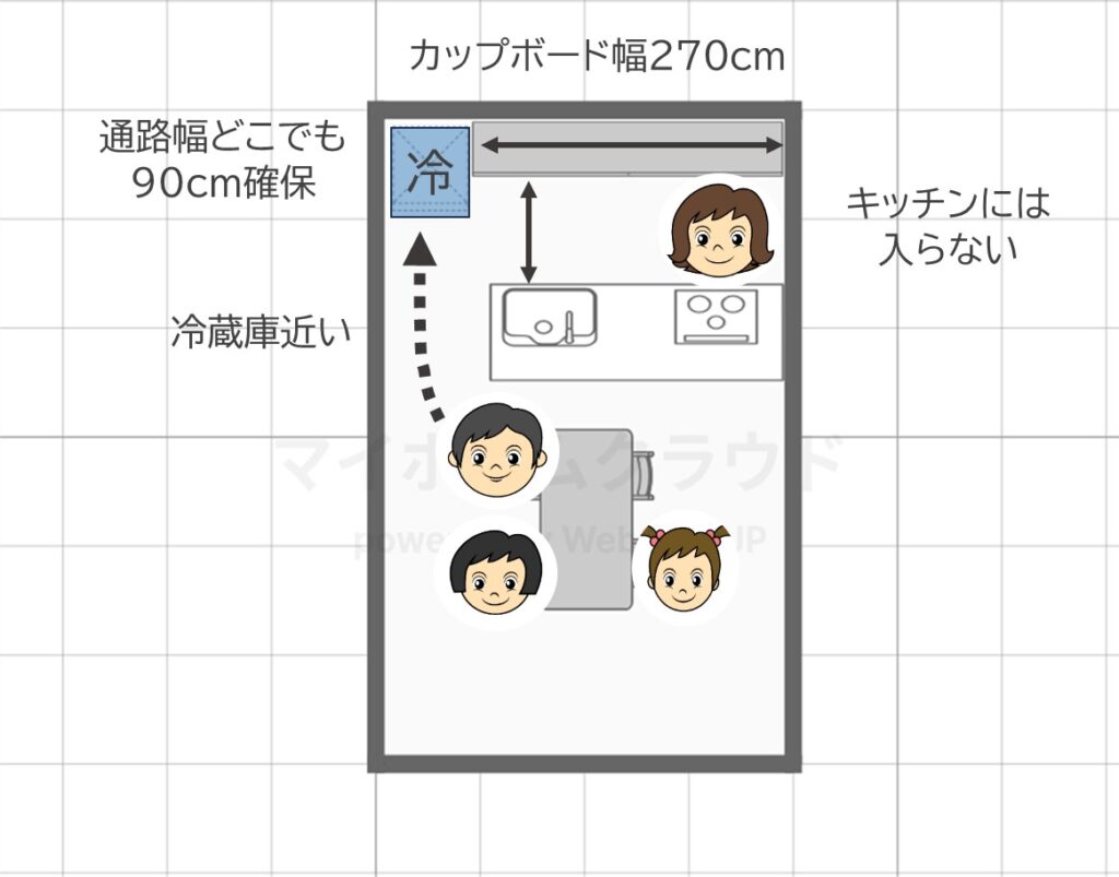 冷蔵庫の位置は手前の手前をおすすめします。料理中誰にも邪魔されないし、収納も通路幅も確保できますからね。冷蔵庫は想像以上に開け閉めすることを考慮して、是非検討してみてください。